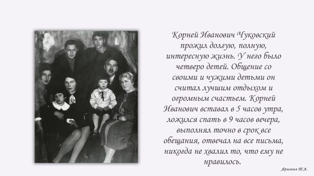 Корней Иванович Чуковский прожил долгую, полную, интересную жизнь. У него было четверо детей. Общение со своими и чужими детьми он считал лучшим отдыхом и огромным счастьем. Корней Иванович вставал в 5 часов утра, ложился спать в 9 часов вечера, выполнял точно в срок все обещания, отвечал на все письма, никогда не хвалил то, что ему не нравилось. Ярыгина Т.А.
