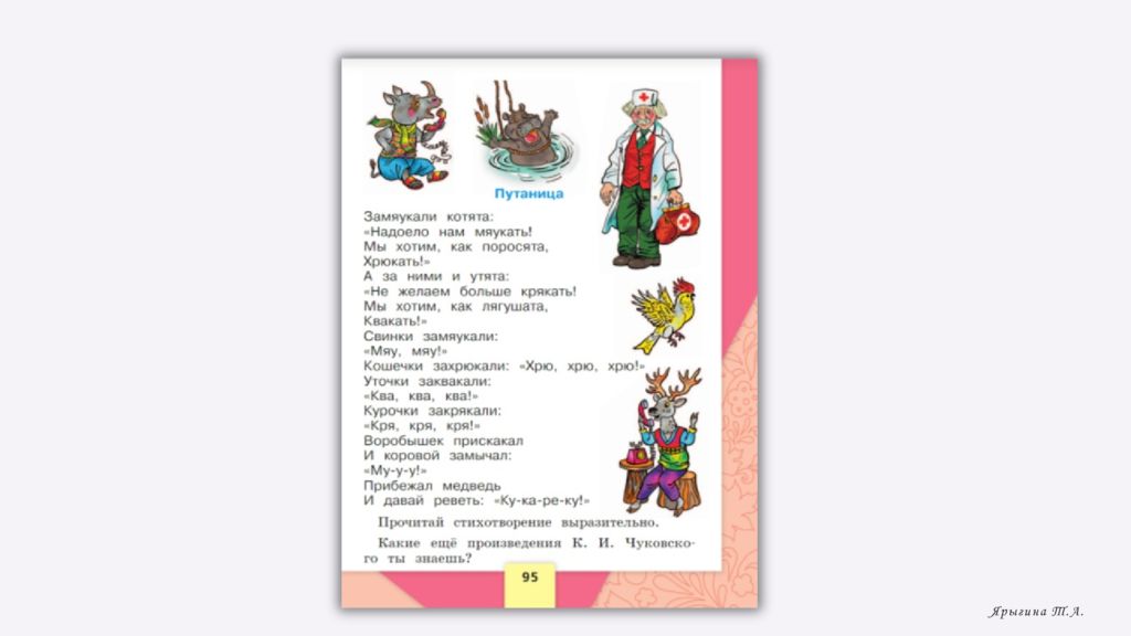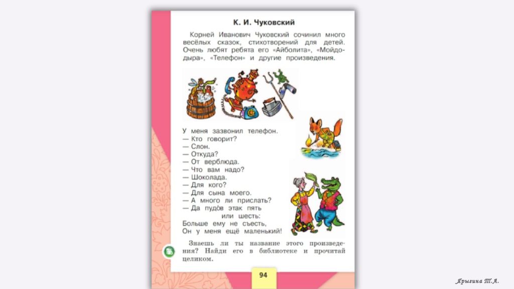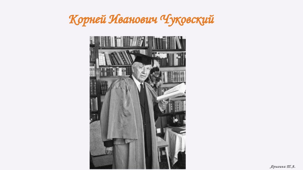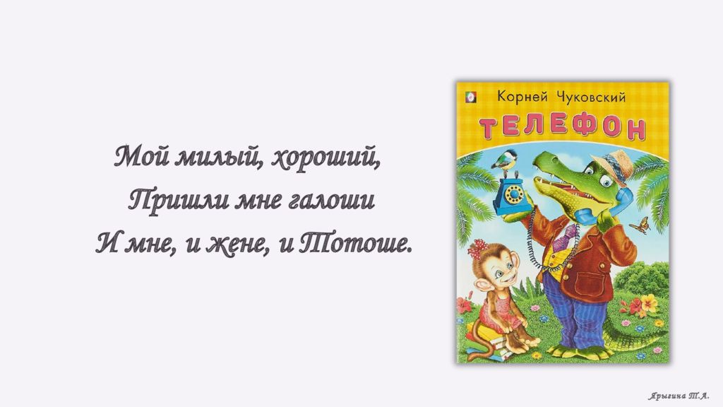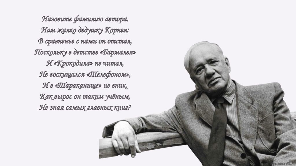 Назовите фамилию автора. Нам жалко дедушку Корнея : В сравненье с нами он отстал, Поскольку в детстве « Бармалея » И « Крокодила » не читал, Не восхищался « Телефоном », И в « Тараканище » не вник. Как вырос он таким учёным, Не зная самых главных книг ? Ярыгина Т.А.
