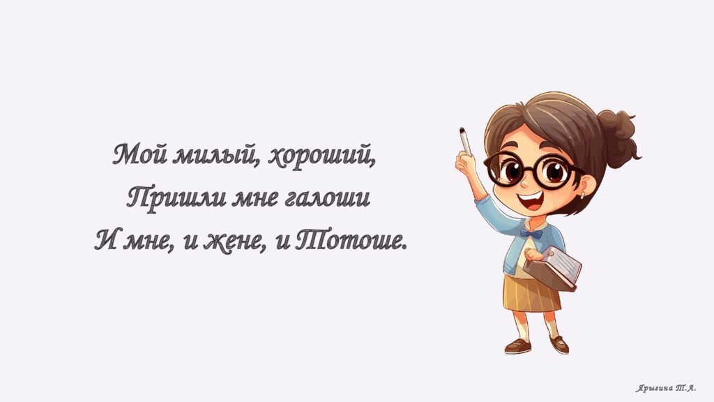 Мой милый, хороший, Пришли мне галоши И мне, и жене, и Тотоше. Ярыгина Т.А.