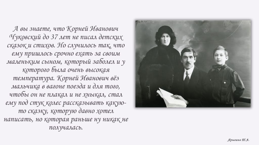 А вы знаете, что Корней Иванович Чуковский до 37 лет не писал детских сказок и стихов. Но случилось так, что ему пришлось срочно ехать за своим маленьким сыном, который заболел и у которого была очень высокая температура. Корней Иванович вёз мальчика в вагоне поезда и для того, чтобы он не плакал и не хныкал, стал ему под стук колес рассказывать какую-то сказку, которую давно хотел написать, но которая раньше ну никак не получалась. Ярыгина Т.А.