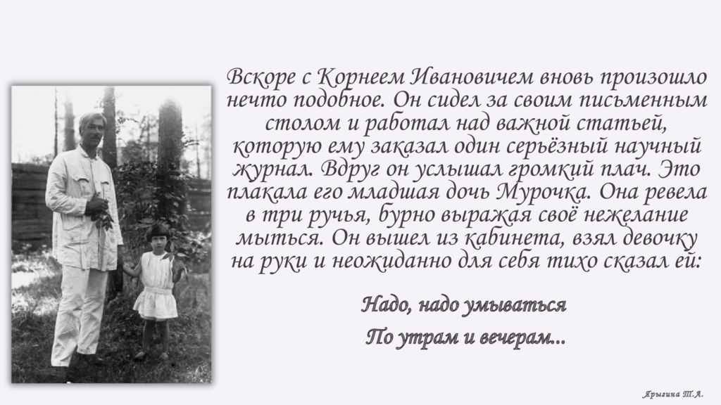 Вскоре с Корнеем Ивановичем вновь произошло нечто подобное. Он сидел за своим письменным столом и работал над важной статьей, которую ему заказал один серьёзный научный журнал. Вдруг он услышал громкий плач. Это плакала его младшая дочь Мурочка. Она ревела в три ручья, бурно выражая своё нежелание мыться. Он вышел из кабинета, взял девочку на руки и неожиданно для себя тихо сказал ей : Надо, надо умываться По утрам и вечерам... Ярыгина Т.А.