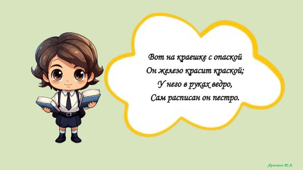 Вот на краешке с опаской Он железо красит краской ; У него в руках ведро, Сам расписан он пестро. Ярыгина Т.А.