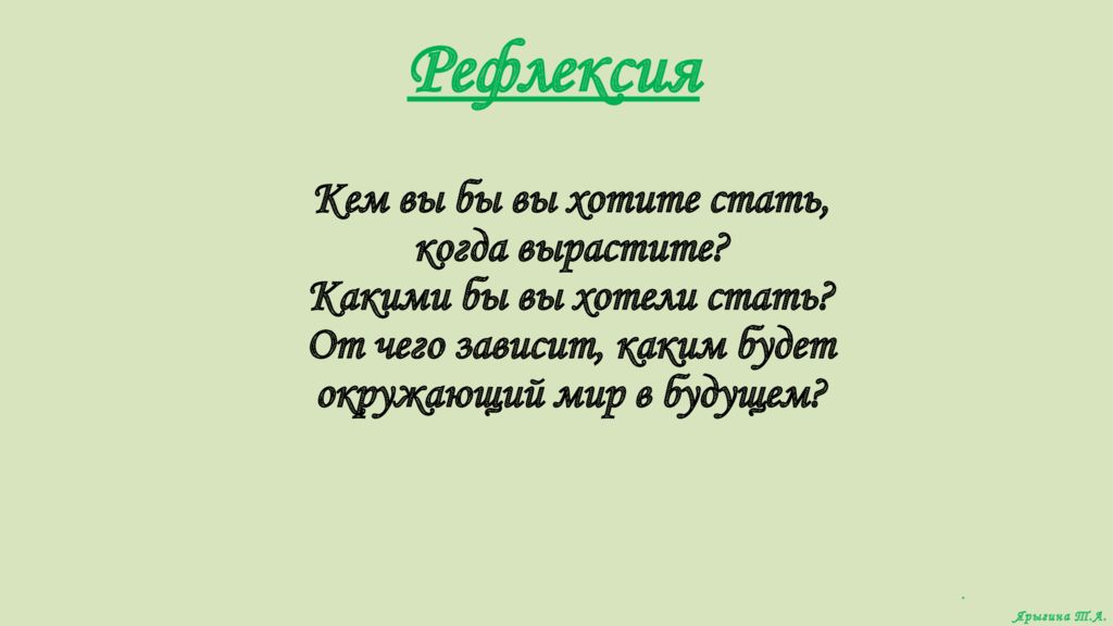Рефлексия . Ярыгина Т.А. Кем вы бы вы хотите стать, когда вырастите ? Какими бы вы хотели стать ? От чего зависит, каким будет окружающий мир в будущем ?