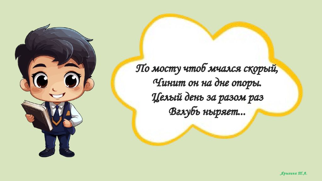 По мосту чтоб мчался скорый, Чинит он на дне опоры. Целый день за разом раз Вглубь ныряет... Ярыгина Т.А.