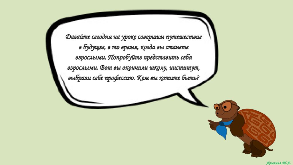 Давайте сегодня на уроке совершим путешествие в будущее, в то время, когда вы станете взрослыми. Попробуйте представить себя взрослыми. Вот вы окончили школу, институт, выбрали себе профессию. Кем вы хотите быть ? Ярыгина Т.А.