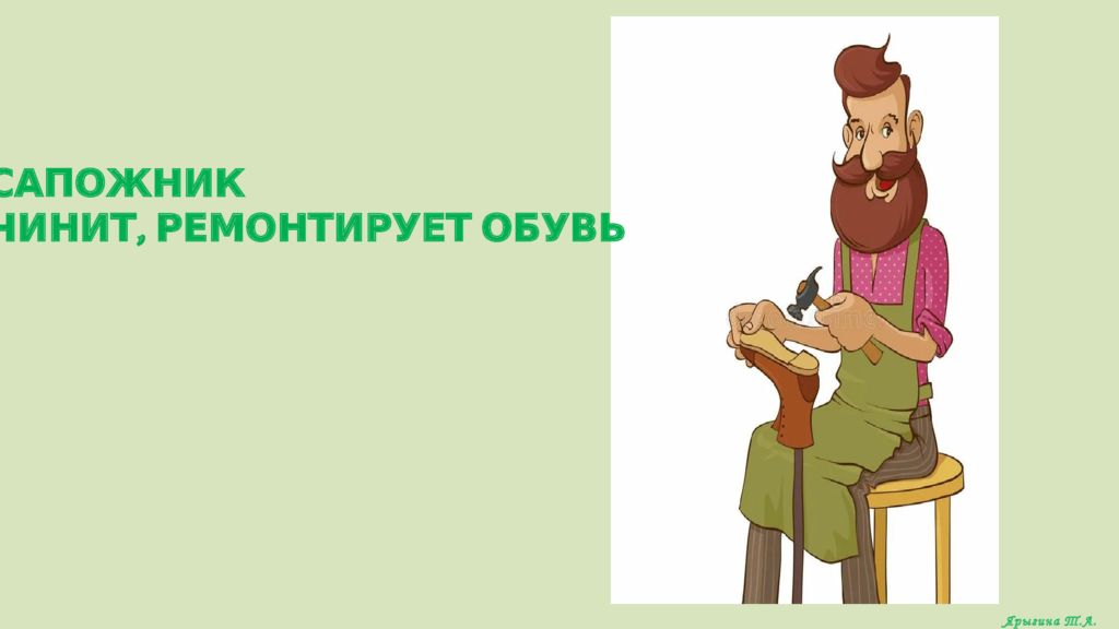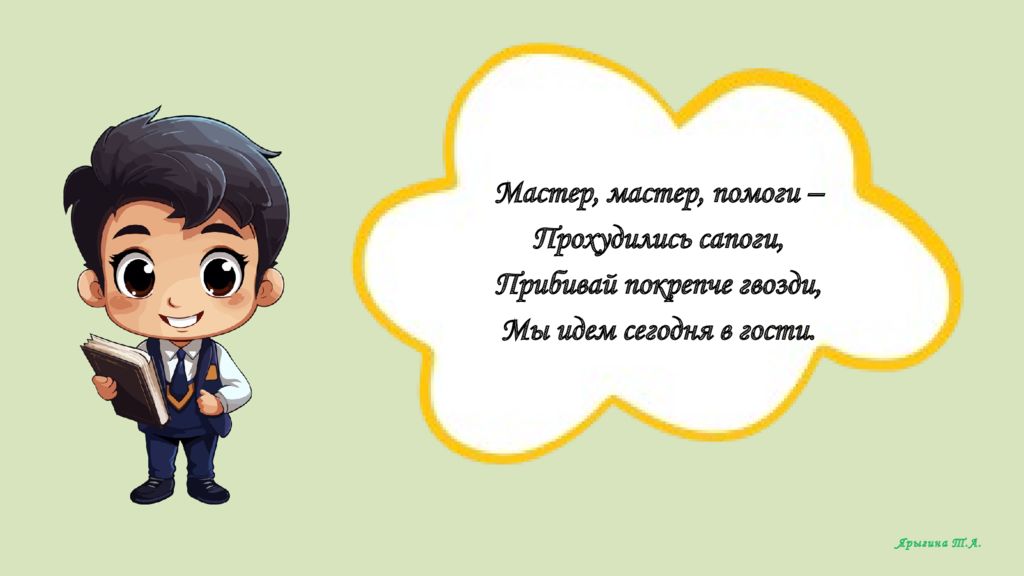 Мастер, мастер, помоги – Прохудились сапоги, Прибивай покрепче гвозди, Мы идем сегодня в гости. Ярыгина Т.А.