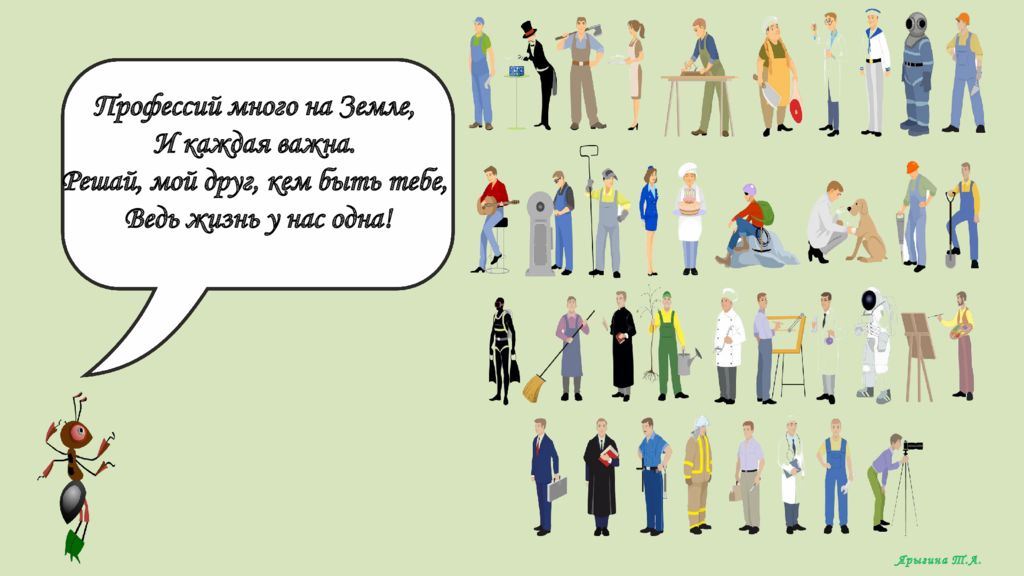 Профессий много на Земле, И каждая важна. Решай, мой друг, кем быть тебе, Ведь жизнь у нас одна ! Ярыгина Т.А.