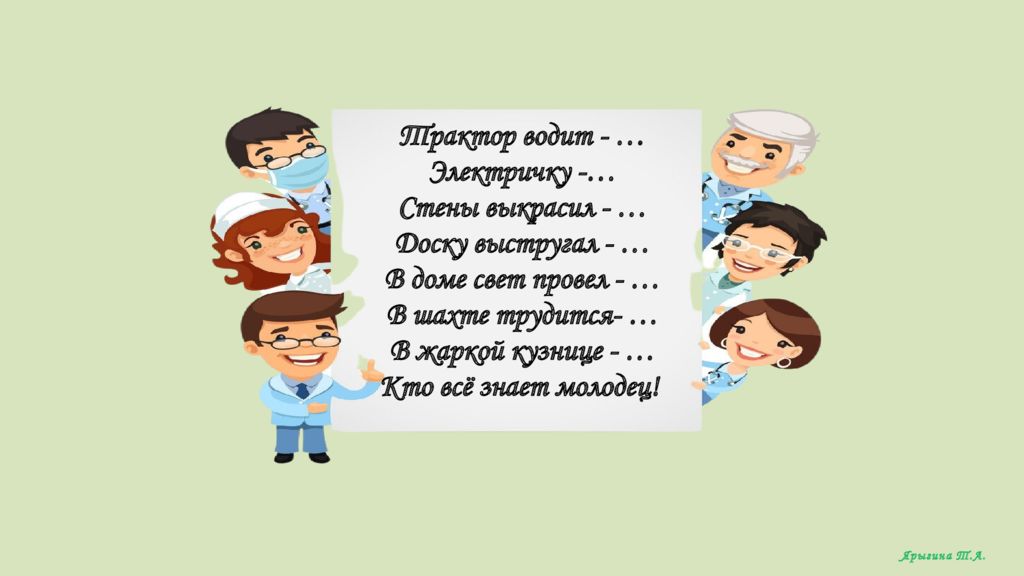 Трактор водит - … Электричку -… Стены выкрасил - … Доску выстругал - … В доме свет провел - … В шахте трудится - … В жаркой кузнице - … Кто всё знает молодец ! Ярыгина Т.А.