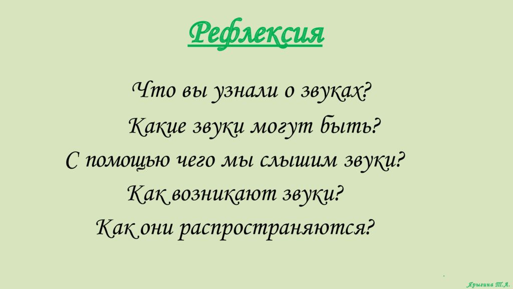 Рефлексия . Ярыгина Т.А. Что вы узнали о звуках? Какие звуки могут быть? С помощью чего мы слышим звуки? Как возникают звуки? Как они распространяются?