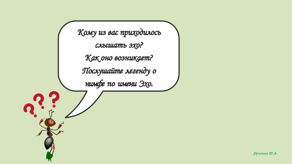 Кому из вас приходилось слышать эхо? Как оно возникает? Послушайте легенду о нимфе по имени Эхо. Ярыгина Т.А.