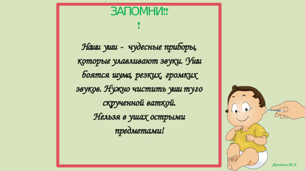 Наши уши - чудесные приборы, которые улавливают звуки. Уши боятся шума, резких, громких звуков. Нужно чистить уши туго скрученной ваткой. Нельзя в ушах острыми предметами! Ярыгина Т.А.