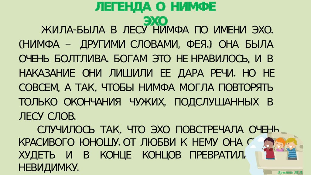 ЖИЛА- БЫЛА В ЛЕСУ НИМФА ПО ИМЕНИ ЭХО. (НИМФА – ДРУГИМИ СЛОВАМИ, ФЕЯ.) ОНА БЫЛА ОЧЕНЬ БОЛТЛИВА. БОГАМ ЭТО НЕ НРАВИЛОСЬ, И В НАКАЗАНИЕ ОНИ ЛИШИЛИ ЕЕ ДАРА РЕЧИ. НО НЕ СОВСЕМ, А ТАК, ЧТОБЫ НИМФА МОГЛА ПОВТОРЯТЬ ТОЛЬКО ОКОНЧАНИЯ ЧУЖИХ, ПОДСЛУШАННЫХ В ЛЕСУ СЛОВ. СЛУЧИЛОСЬ ТАК, ЧТО ЭХО ПОВСТРЕЧАЛА ОЧЕНЬ КРАСИВОГО ЮНОШУ. ОТ ЛЮБВИ К НЕМУ ОНА СТАЛА ХУДЕТЬ И В КОНЦЕ КОНЦОВ ПРЕВРАТИЛАСЬ В НЕВИДИМКУ. ГДЕ ЖЕ ПРЯЧЕТСЯ ЭХО? Ярыгина Т.А.