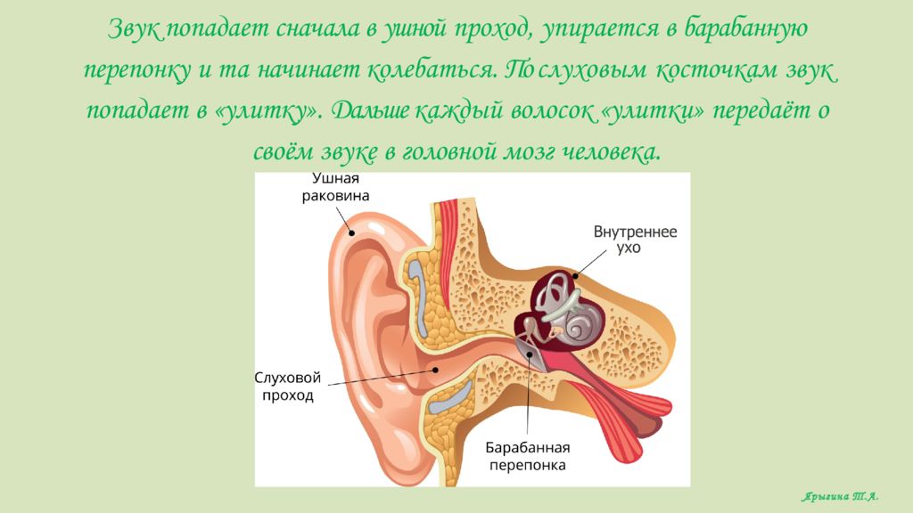 Звук попадает сначала в ушной проход, упирается в барабанную перепонку и та начинает колебаться. По слуховым косточкам звук попадает в «улитку». Дальше каждый волосок «улитки» передаёт о своём звуке в головной мозг человека. Ярыгина Т.А.