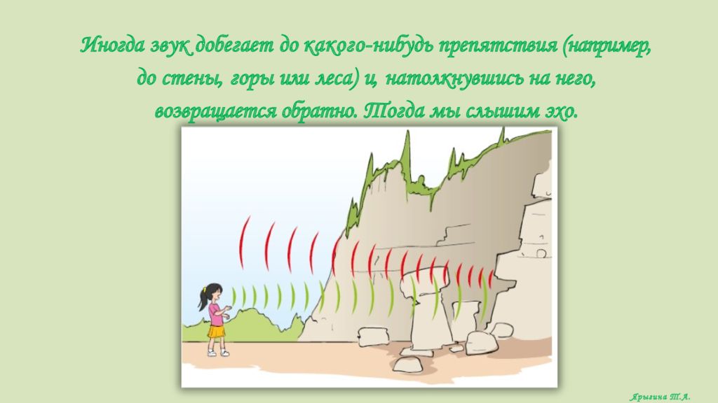 Иногда звук добегает до какого- нибудь препятствия (например, до стены, горы или леса) и, натолкнувшись на него, возвращается обратно. Тогда мы слышим эхо. Ярыгина Т.А.