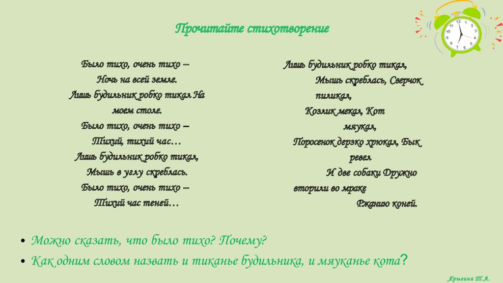 Было тихо, очень тихо – Ночь на всей земле. Лишь будильник робко тикал На моем столе. Было тихо, очень тихо – Тихий, тихий час… Лишь будильник робко тикал, Мышь в углу скреблась. Было тихо, очень тихо – Тихий час теней… Лишь будильник робко тикал, Мышь скреблась, Сверчок пиликал, Козлик мекал, Кот мяукал, Поросенок дерзко хрюкал, Бык ревел И две собаки Дружно вторили во мраке Ржанию коней. Прочитайте стихотворение Можно сказать, что было тихо? Почему? Как одним словом назвать и тиканье будильника, и мяуканье кота ? Ярыгина Т.А.