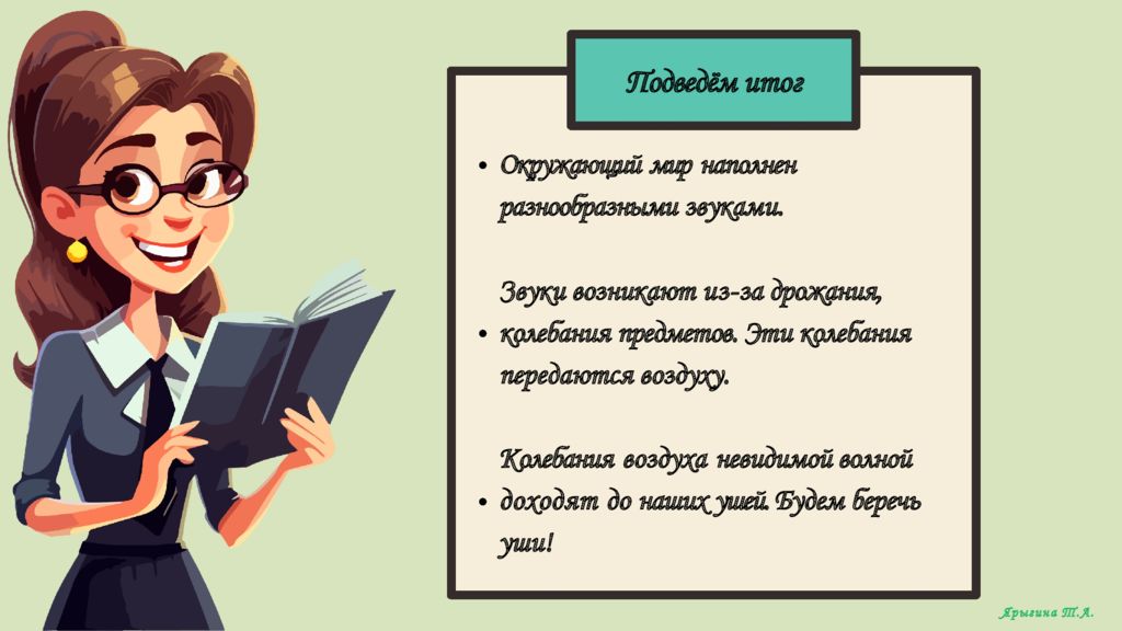 Окружающий мир наполнен разнообразными звуками. Звуки возникают из- за дрожания, колебания предметов. Эти колебания передаются воздуху. Колебания воздуха невидимой волной доходят до наших ушей. Будем беречь уши! Подведём итог Ярыгина Т.А.
