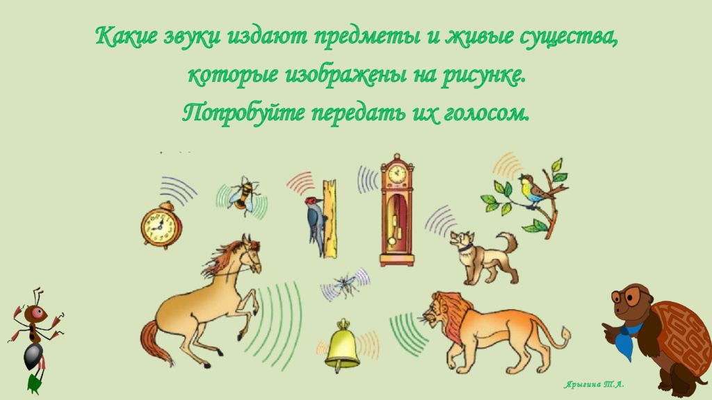 Какие звуки издают предметы и живые существа, которые изображены на рисунке. Попробуйте передать их голосом. Ярыгина Т.А.