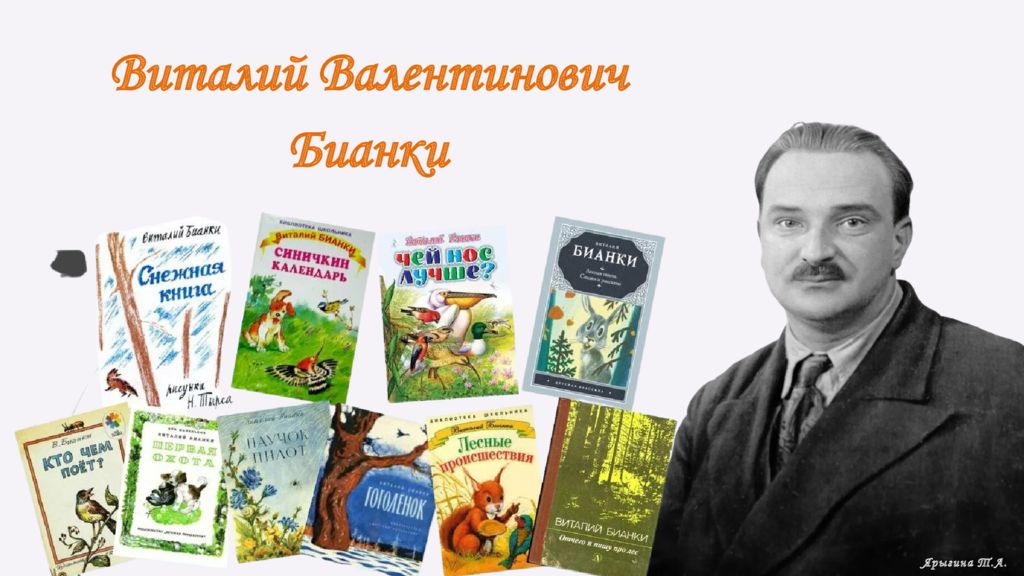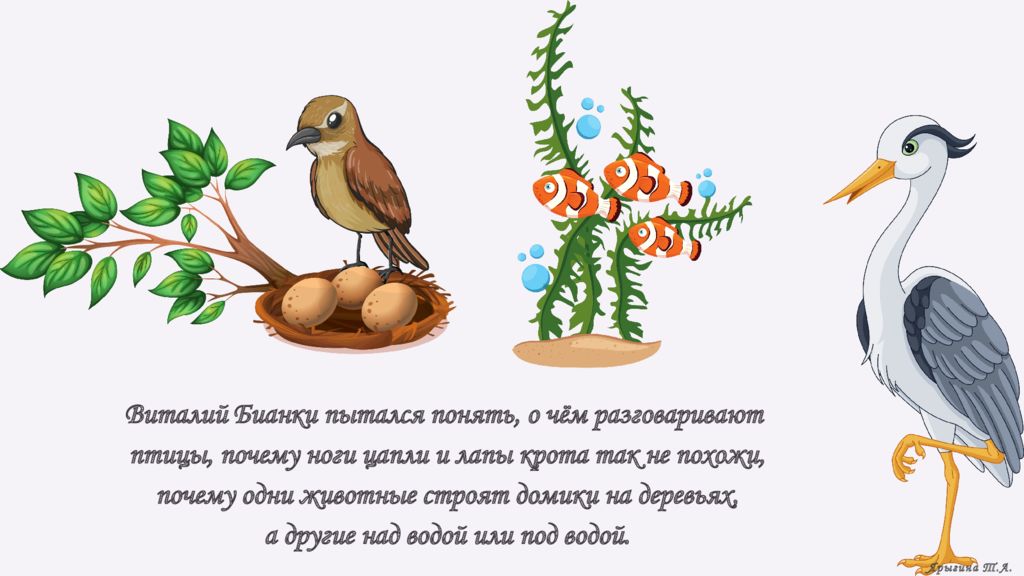 Виталий Бианки пытался понять, о чём разговаривают птицы, почему ноги цапли и лапы крота так не похожи, почему одни животные строят домики на деревьях, а другие над водой или под водой. Ярыгина Т.А.