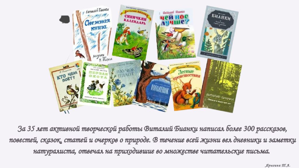За 35 лет активной творческой работы Виталий Бианки написал более 300 рассказов, повестей, сказок, статей и очерков о природе. В течение всей жизни вел дневники и заметки натуралиста, отвечал на приходившие во множестве читательские письма. Ярыгина Т.А.