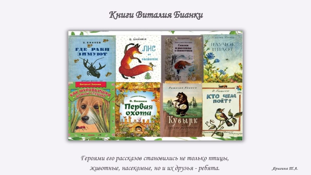 Героями его рассказов становились не только птицы, животные, насекомые, но и их друзья - ребята. Книги Виталия Бианки Ярыгина Т.А.