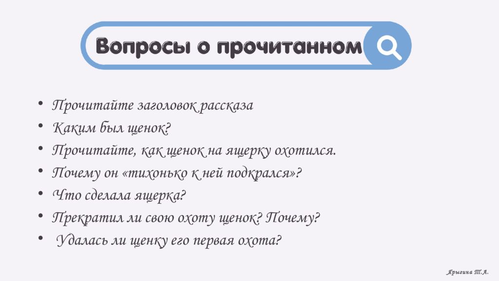 Прочитайте заголовок рассказа Каким был щенок ? Прочитайте, как щенок на ящерку охотился. Почему он « тихонько к ней подкрался »? Что сделала ящерка ? Прекратил ли свою охоту щенок ? Почему ? Удалась ли щенку его первая охота ? Ярыгина Т.А.