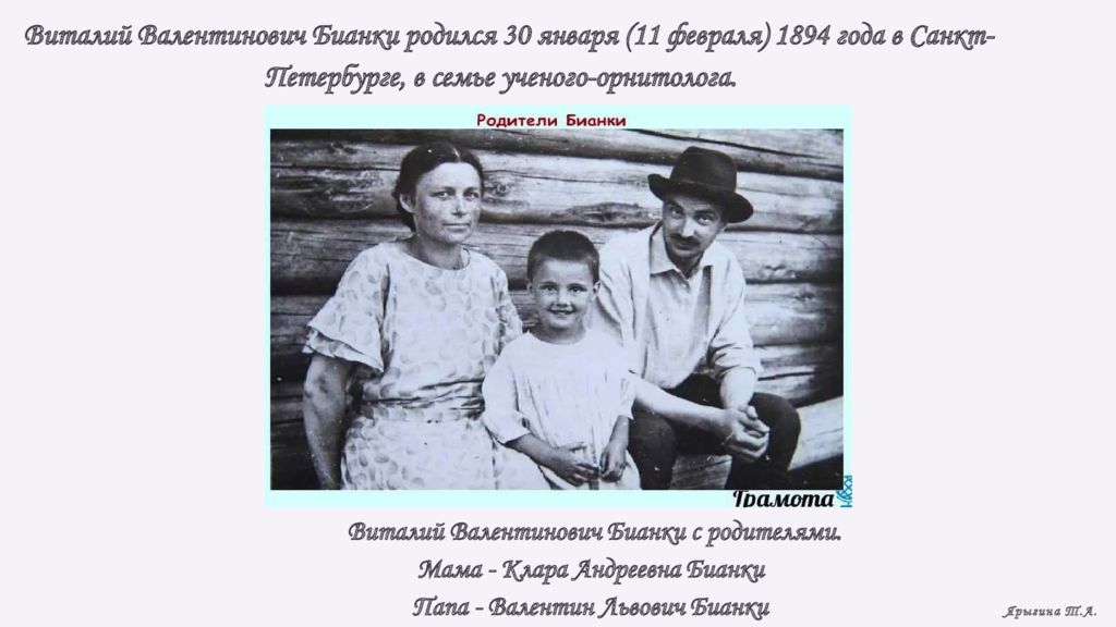 Виталий Валентинович Бианки родился 30 января (11 февраля ) 1894 года в Санкт-Петербурге, в семье ученого-орнитолога. Виталий Валентинович Бианки с родителями. Мама - Клара Андреевна Бианки Папа - Валентин Львович Бианки Ярыгина Т.А.