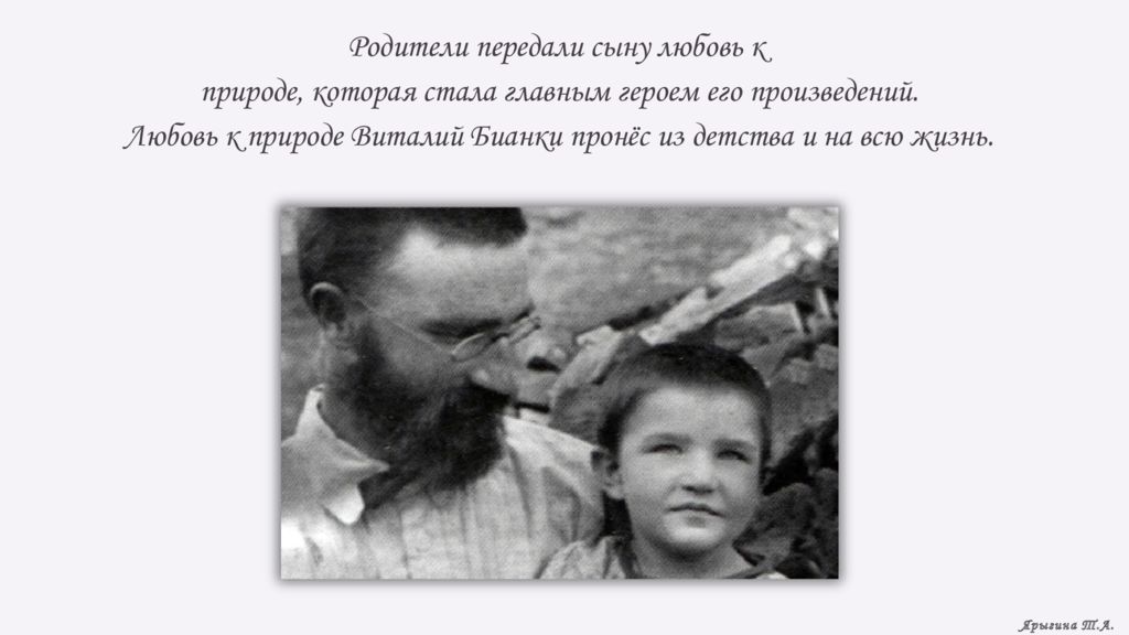 Родители передали сыну любовь к природе, которая стала главным героем его произведений. Любовь к природе Виталий Бианки пронёс из детства и на всю жизнь. Ярыгина Т.А.