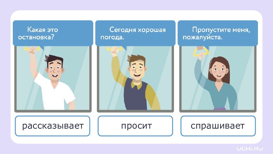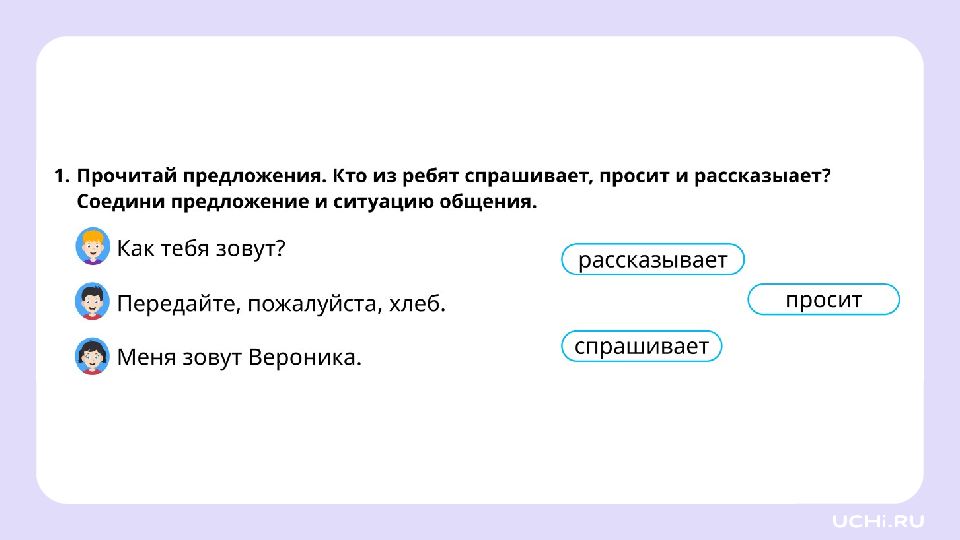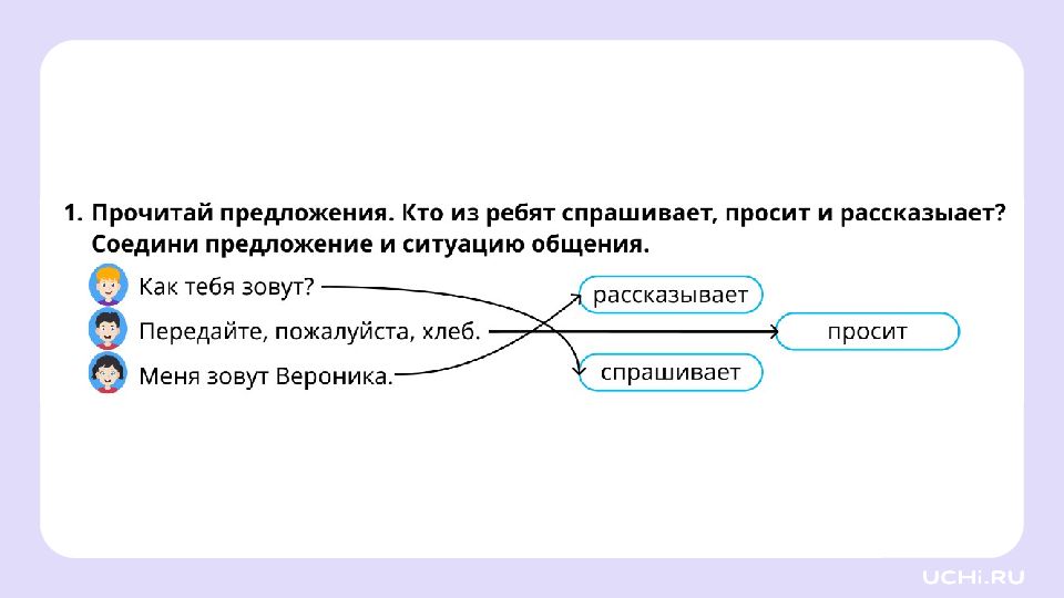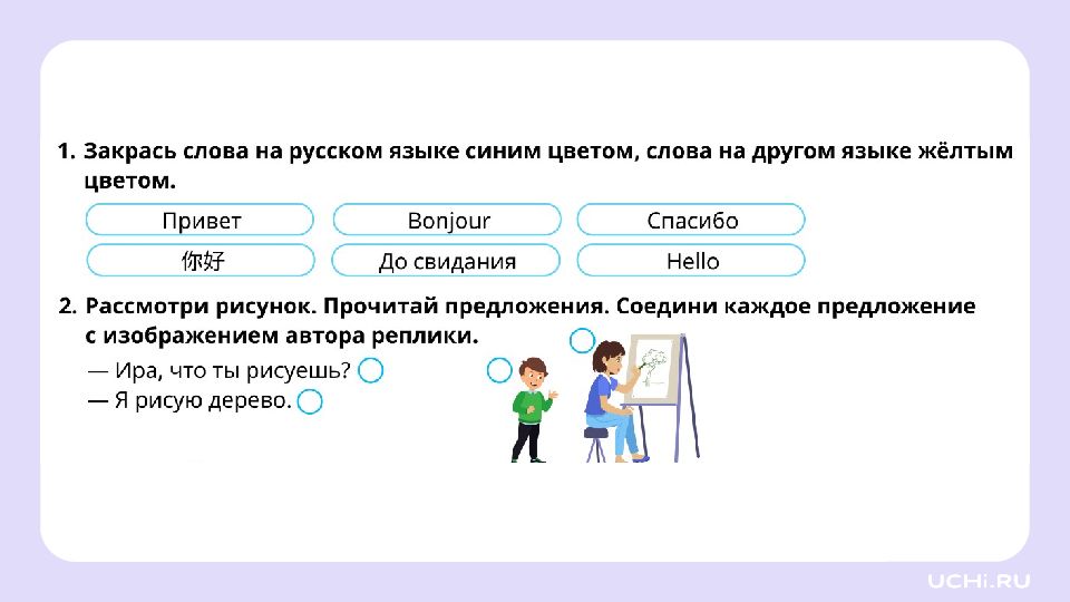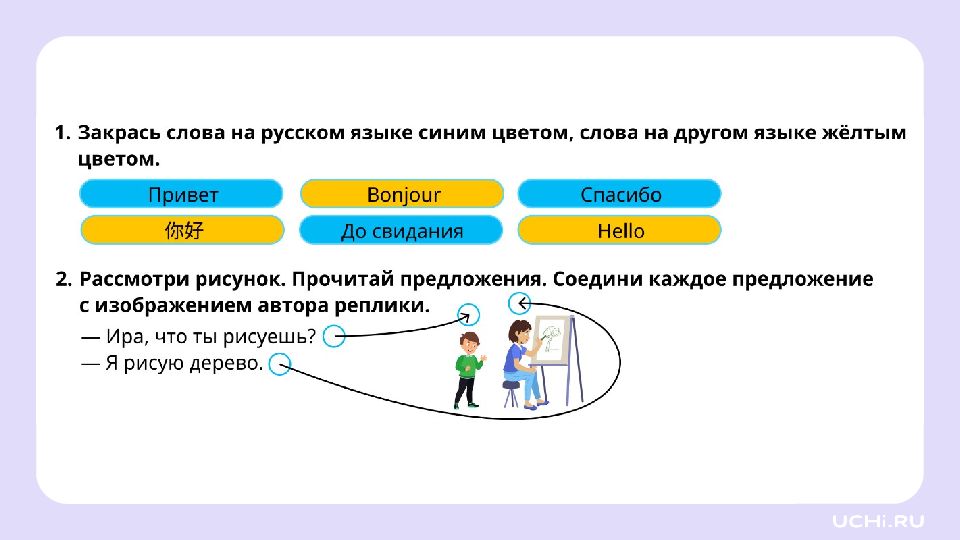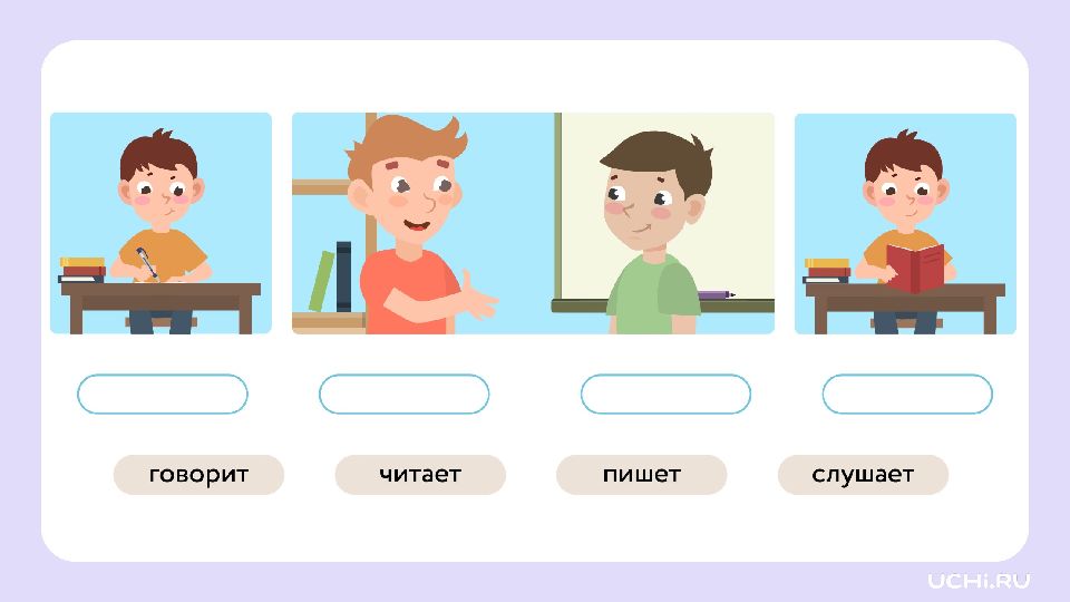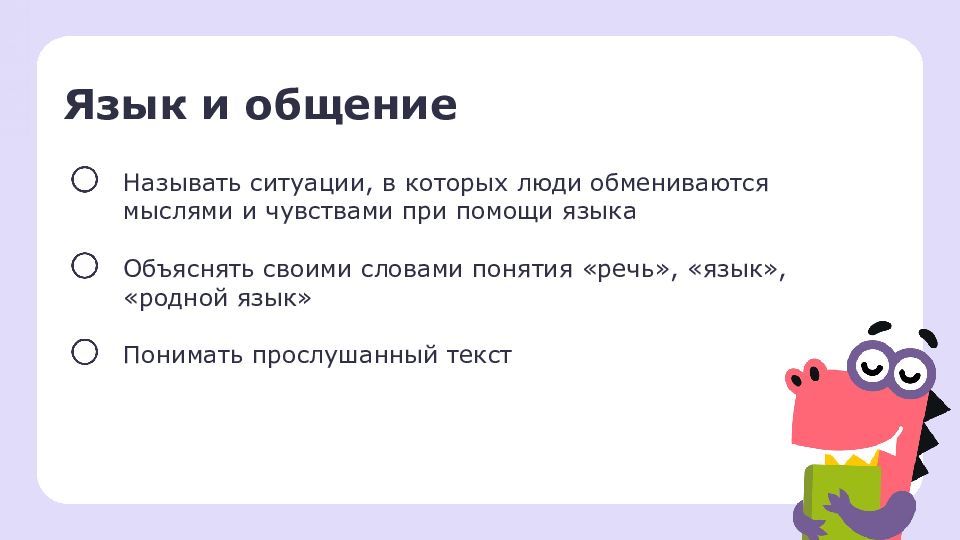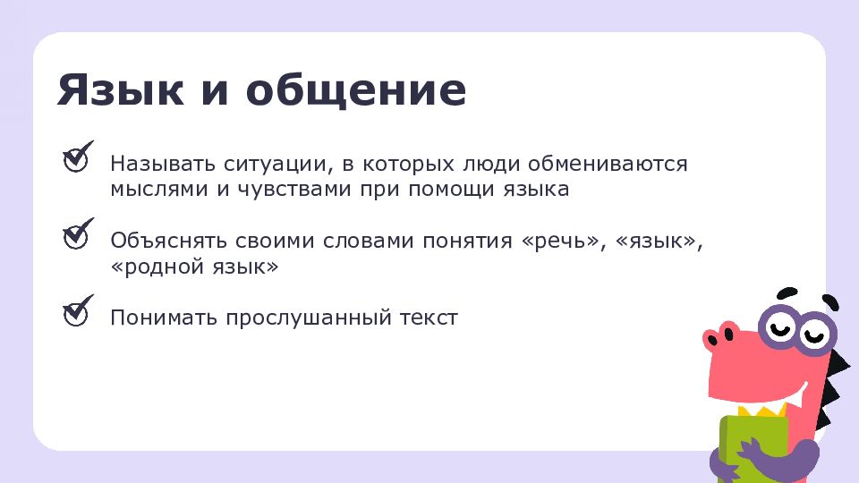 Язык и общение Называть ситуации, в которых люди обмениваются мыслями и чувствами при помощи языка Объяснять своими словами понятия «речь», «язык», «родной язык» Понимать прослушанный текст