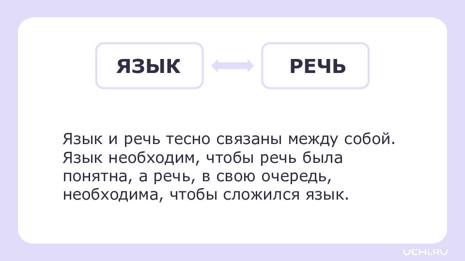 Язык и речь тесно связаны между собой. Язык необходим, чтобы речь была понятна, а речь, в свою очередь, необходима, чтобы сложился язык. ЯЗЫК РЕЧЬ