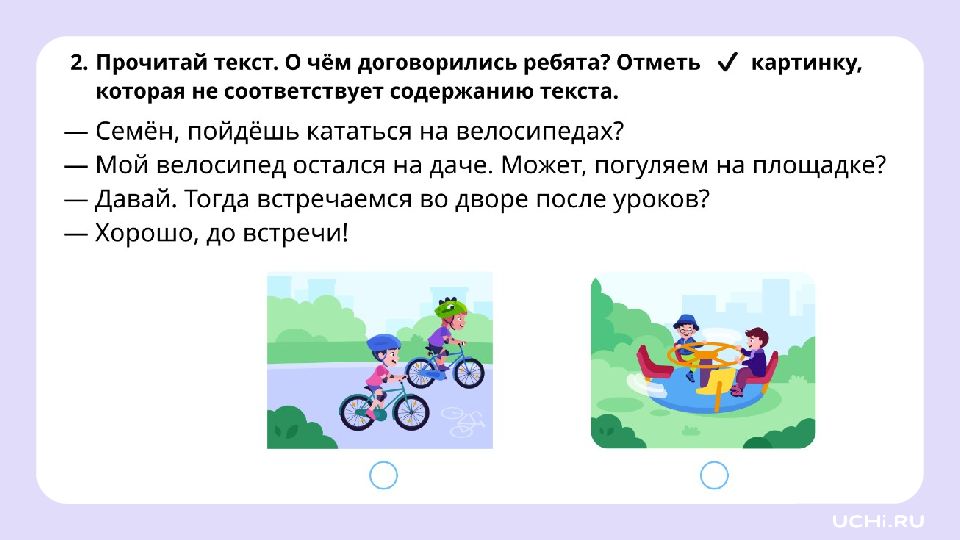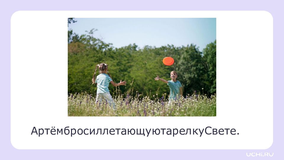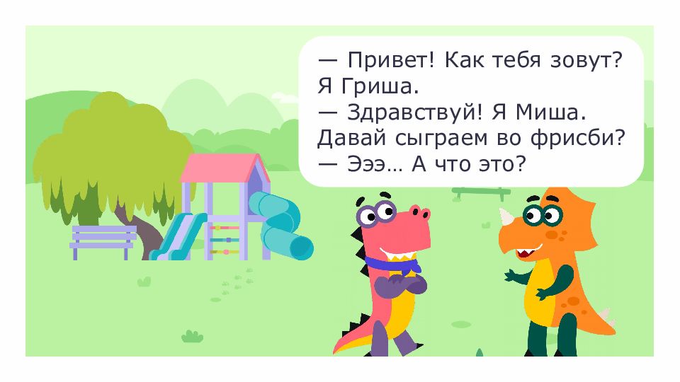 — Привет! Как тебя зовут? Я Гриша. — Здравствуй! Я Миша. Давай сыграем во фрисби? — Эээ… А что это?