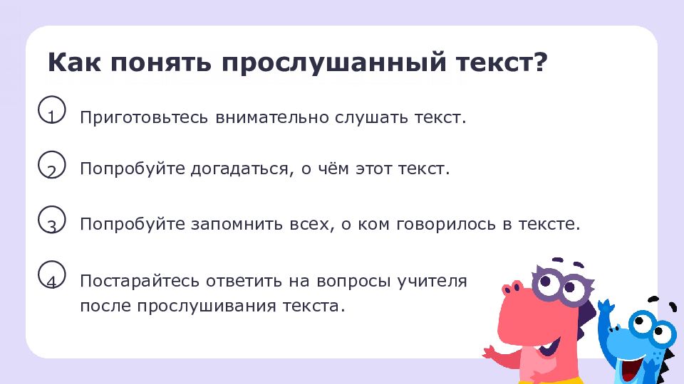 Как понять прослушанный текст? Приготовьтесь внимательно слушать текст. Попробуйте догадаться, о чём этот текст. Попробуйте запомнить всех, о ком говорилось в тексте. Постарайтесь ответить на вопросы учителя после прослушивания текста. 1 2 3 4