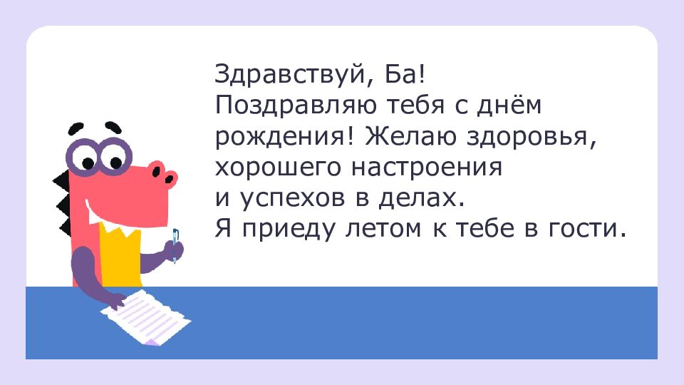 Здравствуй, Ба ! Поздравляю тебя с днём рождения! Желаю здоровья, хорошего настроения и успехов в делах. Я приеду летом к тебе в гости.
