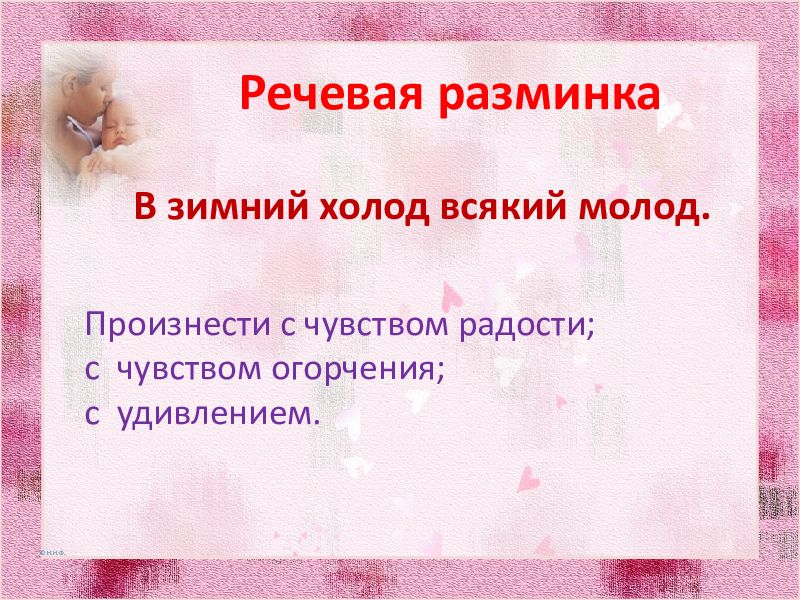 Произнести с чувством радости; с чувством огорчения; с удивлением. Речевая разминка В зимний холод всякий молод.
