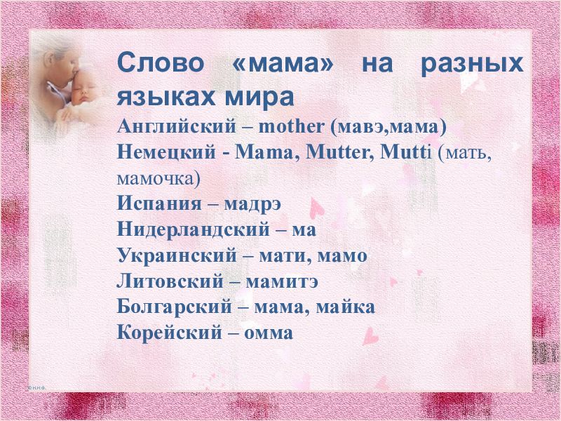 Слово «мама» на разных языках мира Английский – mother ( мавэ,мама ) Немецкий - Mama, Mutter, Mutt i ( мать, мамочка) Испания – мадрэ Нидерландский – ма Украинский – мати, мамо Литовский – мамитэ Болгарский – мама, майка Корейский – омма