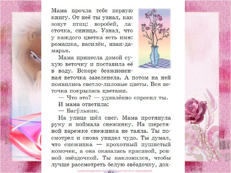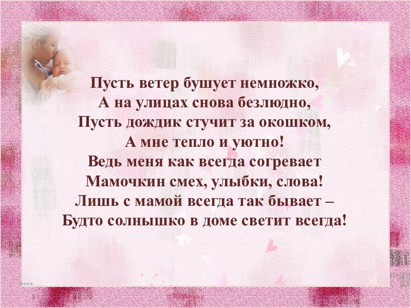 Пусть ветер бушует немножко, А на улицах снова безлюдно, Пусть дождик стучит за окошком, А мне тепло и уютно! Ведь меня как всегда согревает Мамочкин смех, улыбки, слова! Лишь с мамой всегда так бывает – Будто солнышко в доме светит всегда!