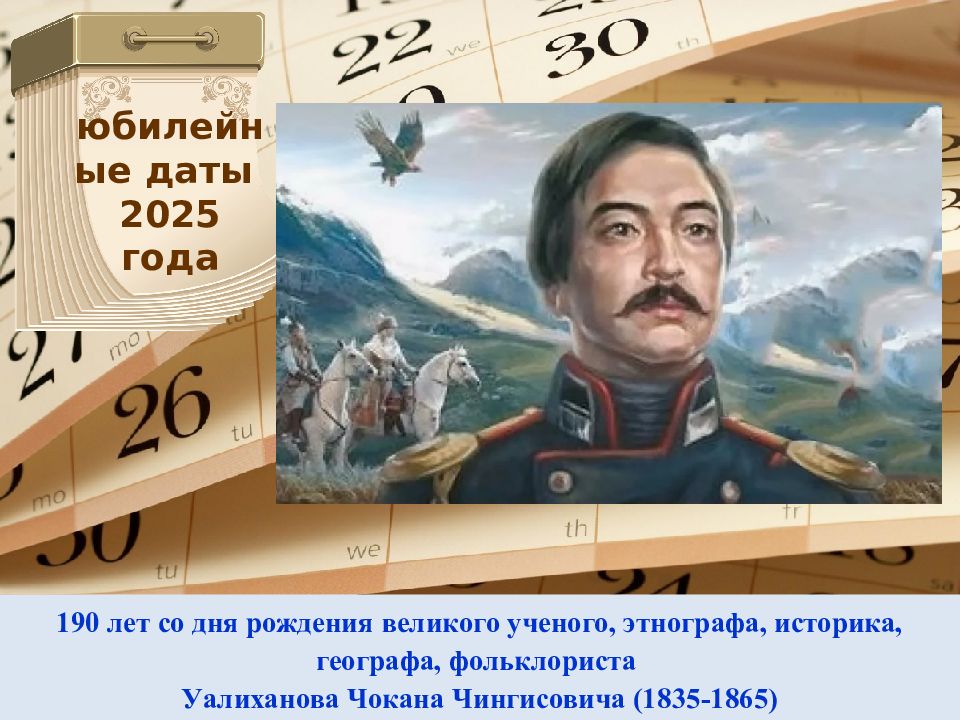 190 лет со дня рождения великого ученого, этнографа, историка, географа, фольклориста Уалиханова Чокана Чингисовича (1835-1865) юбилейные даты 2025 года