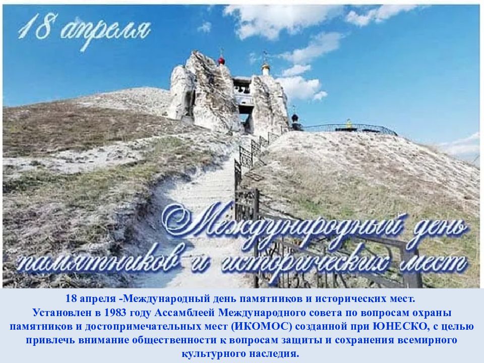 18 апреля -Международный день памятников и исторических мест. Установлен в 1983 году Ассамблеей Международного совета по вопросам охраны памятников и достопримечательных мест (ИКОМОС) созданной при ЮНЕСКО, с целью привлечь внимание общественности к вопросам защиты и сохранения всемирного культурного наследия.