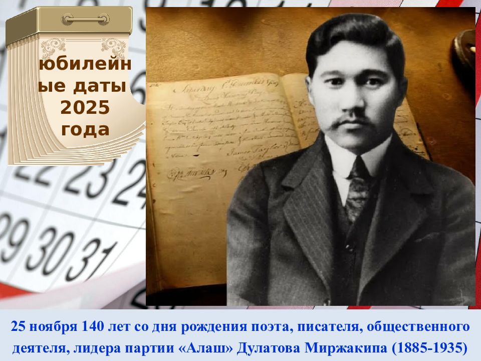 25 ноября 140 лет со дня рождения поэта, писателя, общественного деятеля, лидера партии «Алаш» Дулатова Миржакипа (1885-1935) юбилейные даты 2025 года