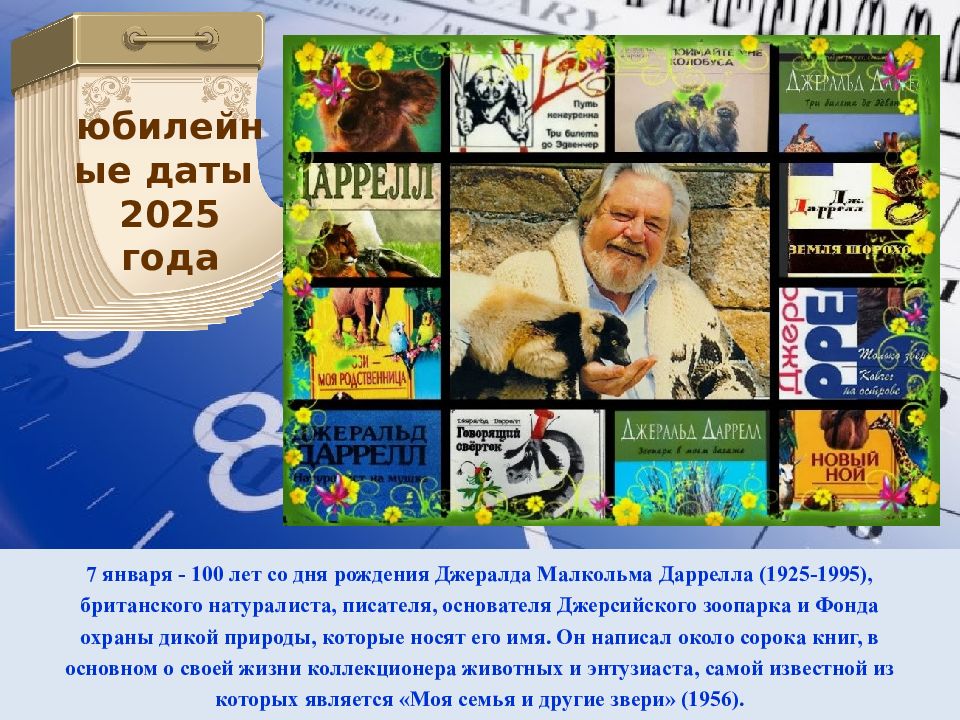 7 января - 100 лет со дня рождения Джералда Малкольма Даррелла (1925-1995), британского натуралиста, писателя, основателя Джерсийского зоопарка и Фонда охраны дикой природы, которые носят его имя. Он написал около сорока книг, в основном о своей жизни коллекционера животных и энтузиаста, самой известной из которых является «Моя семья и другие звери» (1956). юбилейные даты 2025 года