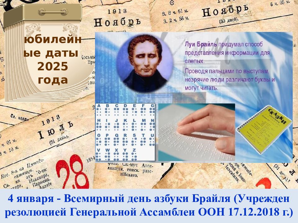 4 января - Всемирный день азбуки Брайля (Учрежден резолюцией Генеральной Ассамблеи ООН 17.12.2018 г.) юбилейные даты 2025 года