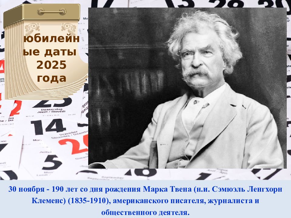 30 ноября - 190 лет со дня рождения Марка Твена (н.и. Сэмюэль Ленгхорн Клеменс ) (1835-1910), американского писателя, журналиста и общественного деятеля. юбилейные даты 2025 года