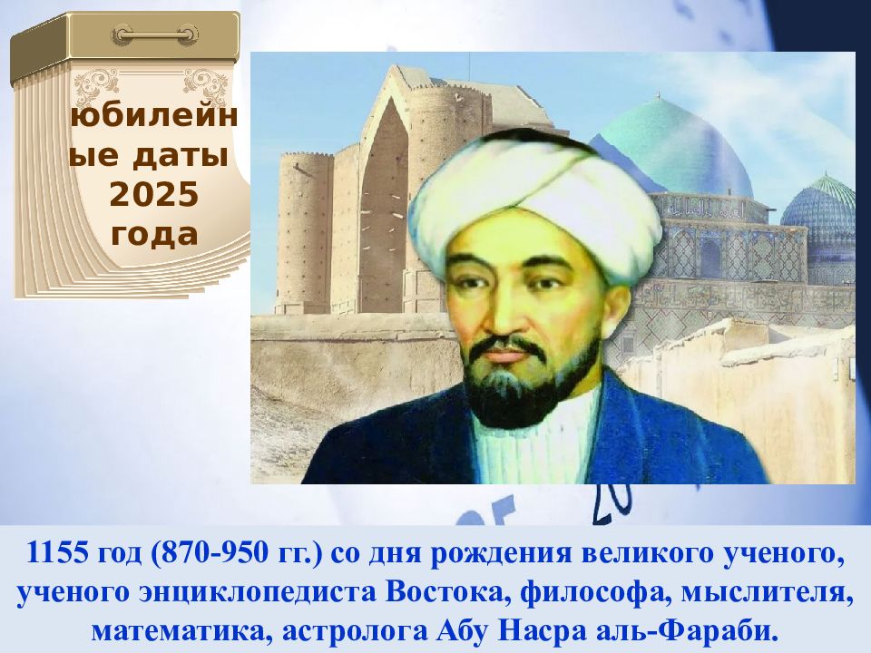 1155 год (870-950 гг.) со дня рождения великого ученого, ученого энциклопедиста Востока, философа, мыслителя, математика, астролога Абу Насра аль-Фараби. юбилейные даты 2025 года