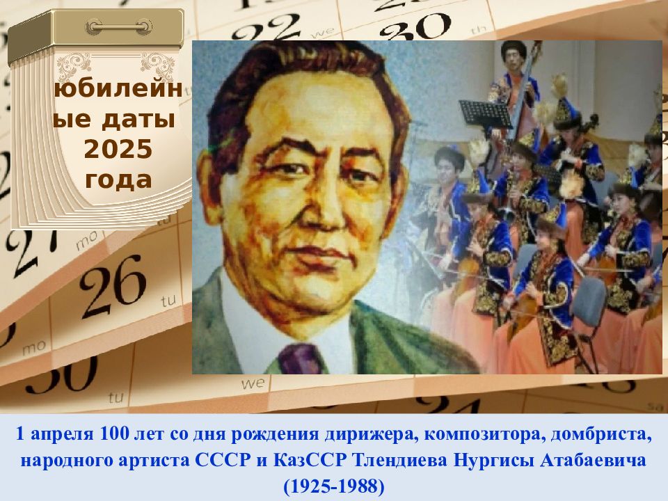 1 апреля 100 лет со дня рождения дирижера, композитора, домбриста, народного артиста СССР и КазССР Тлендиева Нургисы Атабаевича (1925-1988) юбилейные даты 2025 года