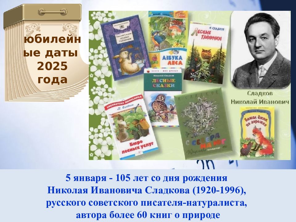 5 января - 105 лет со дня рождения Николая Ивановича Сладкова (1920-1996), русского советского писателя-натуралиста, автора более 60 книг о природе юбилейные даты 2025 года