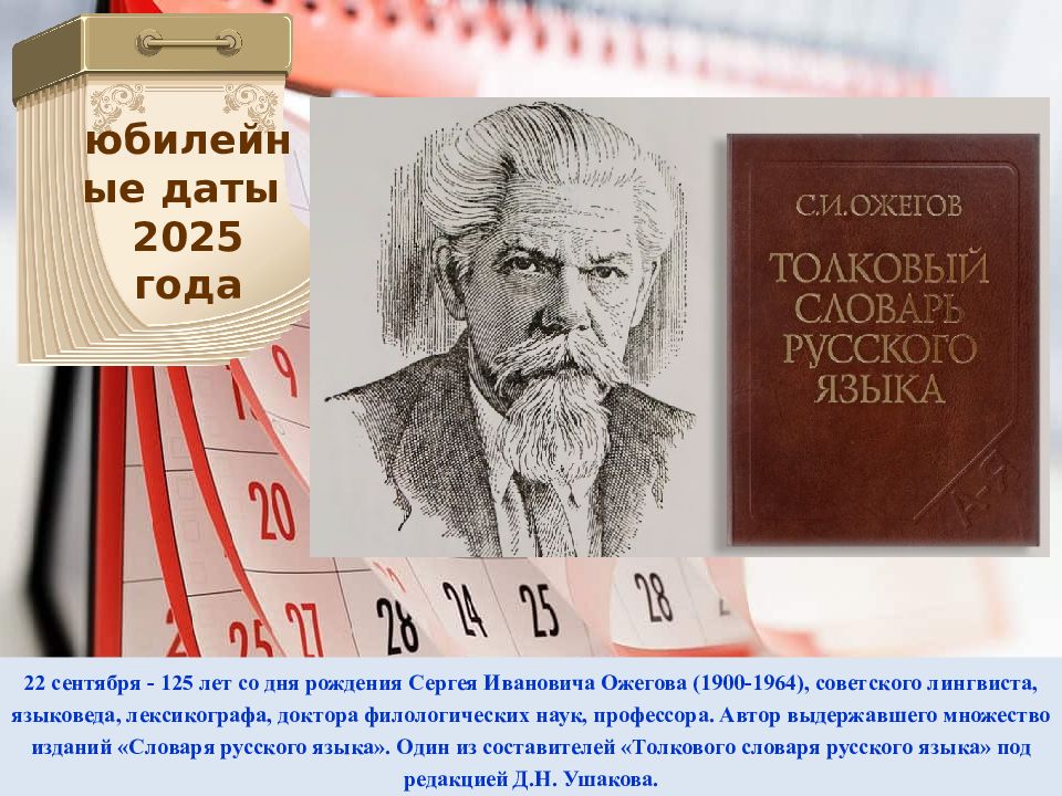 22 сентября - 125 лет со дня рождения Сергея Ивановича Ожегова (1900-1964), советского лингвиста, языковеда, лексикографа, доктора филологических наук, профессора. Автор выдержавшего множество изданий «Словаря русского языка». Один из составителей «Толкового словаря русского языка» под редакцией Д.Н. Ушакова. юбилейные даты 2025 года