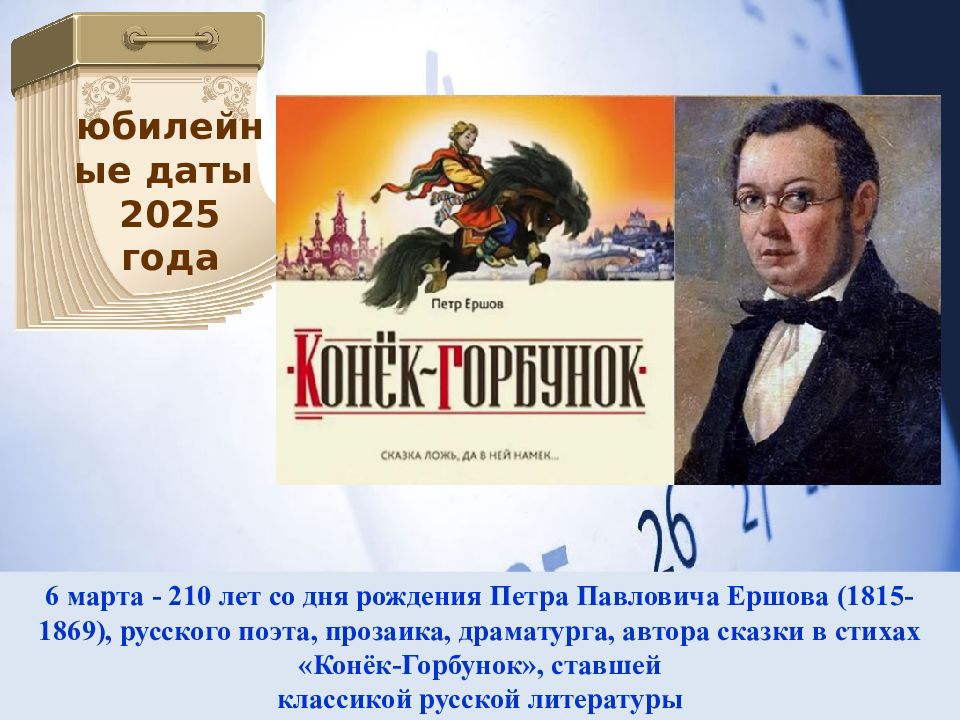 6 марта - 210 лет со дня рождения Петра Павловича Ершова (1815-1869), русского поэта, прозаика, драматурга, автора сказки в стихах «Конёк-Горбунок», ставшей классикой русской литературы юбилейные даты 2025 года