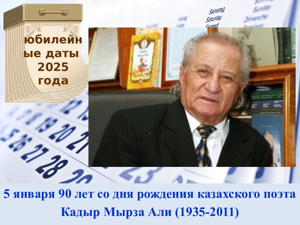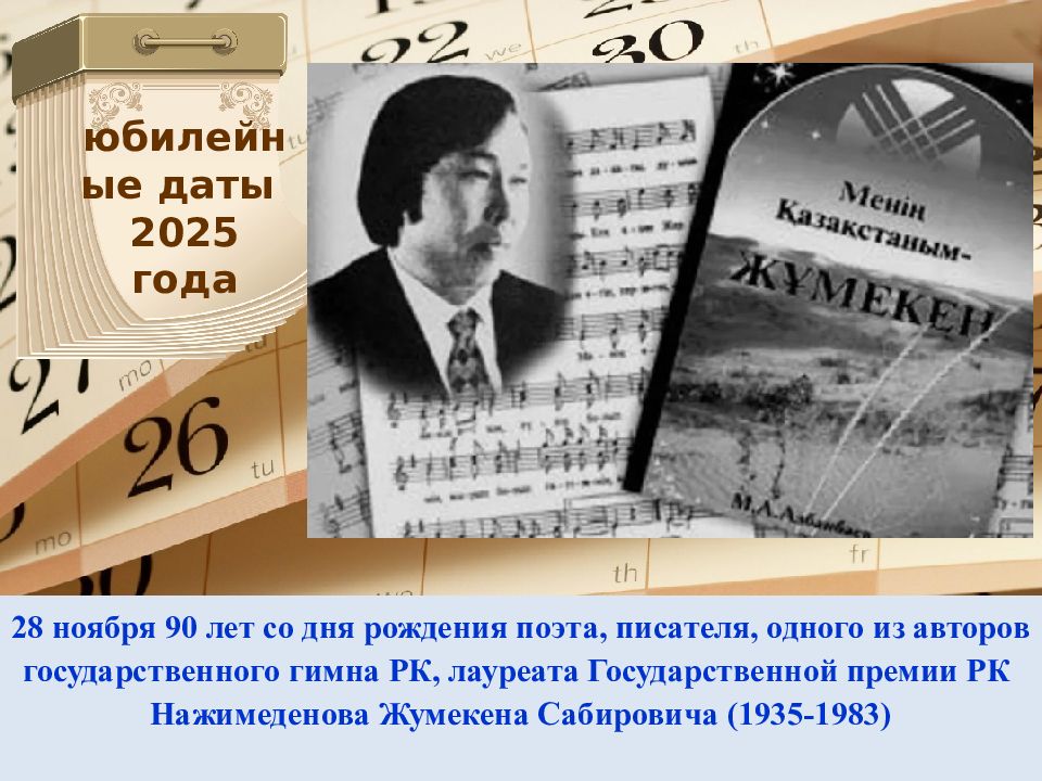 28 ноября 90 лет со дня рождения поэта, писателя, одного из авторов государственного гимна РК, лауреата Государственной премии РК Нажимеденова Жумекена Сабировича (1935-1983) юбилейные даты 2025 года