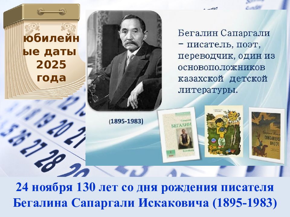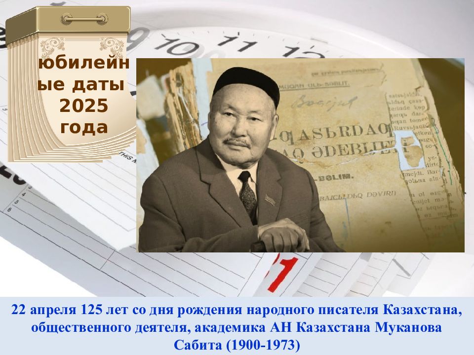 22 апреля 125 лет со дня рождения народного писателя Казахстана, общественного деятеля, академика АН Казахстана Муканова Сабита (1900-1973) юбилейные даты 2025 года