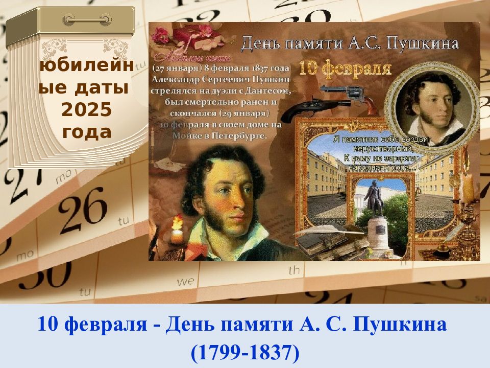 10 февраля - День памяти А. С. Пушкина ( 1799-1837 ) юбилейные даты 2025 года