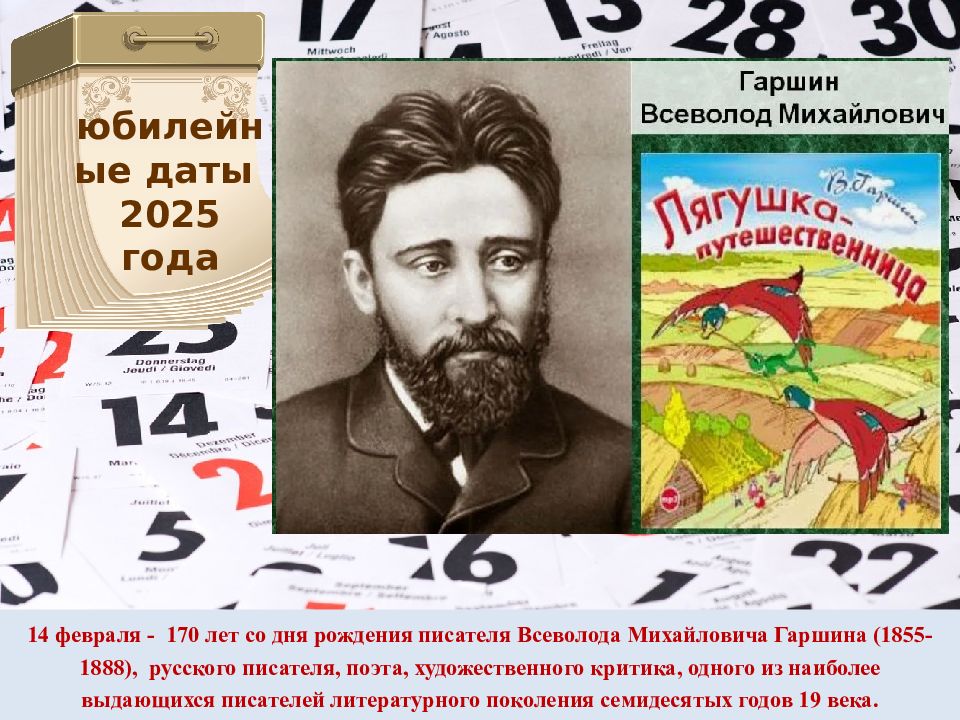 14 февраля - 170 лет со дня рождения писателя Всеволода Михайловича Гаршина (1855-1888), русского писателя, поэта, художественного критика, одного из наиболее выдающихся писателей литературного поколения семидесятых годов 19 века. юбилейные даты 2025 года
